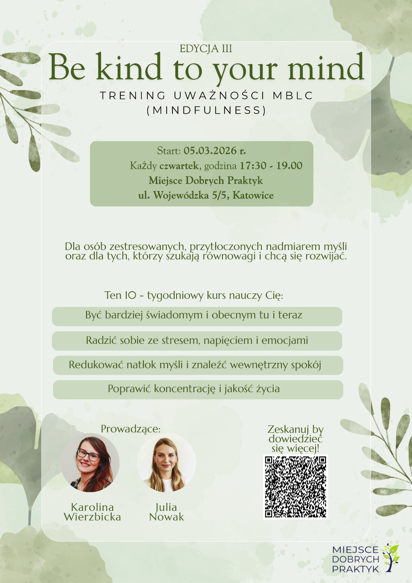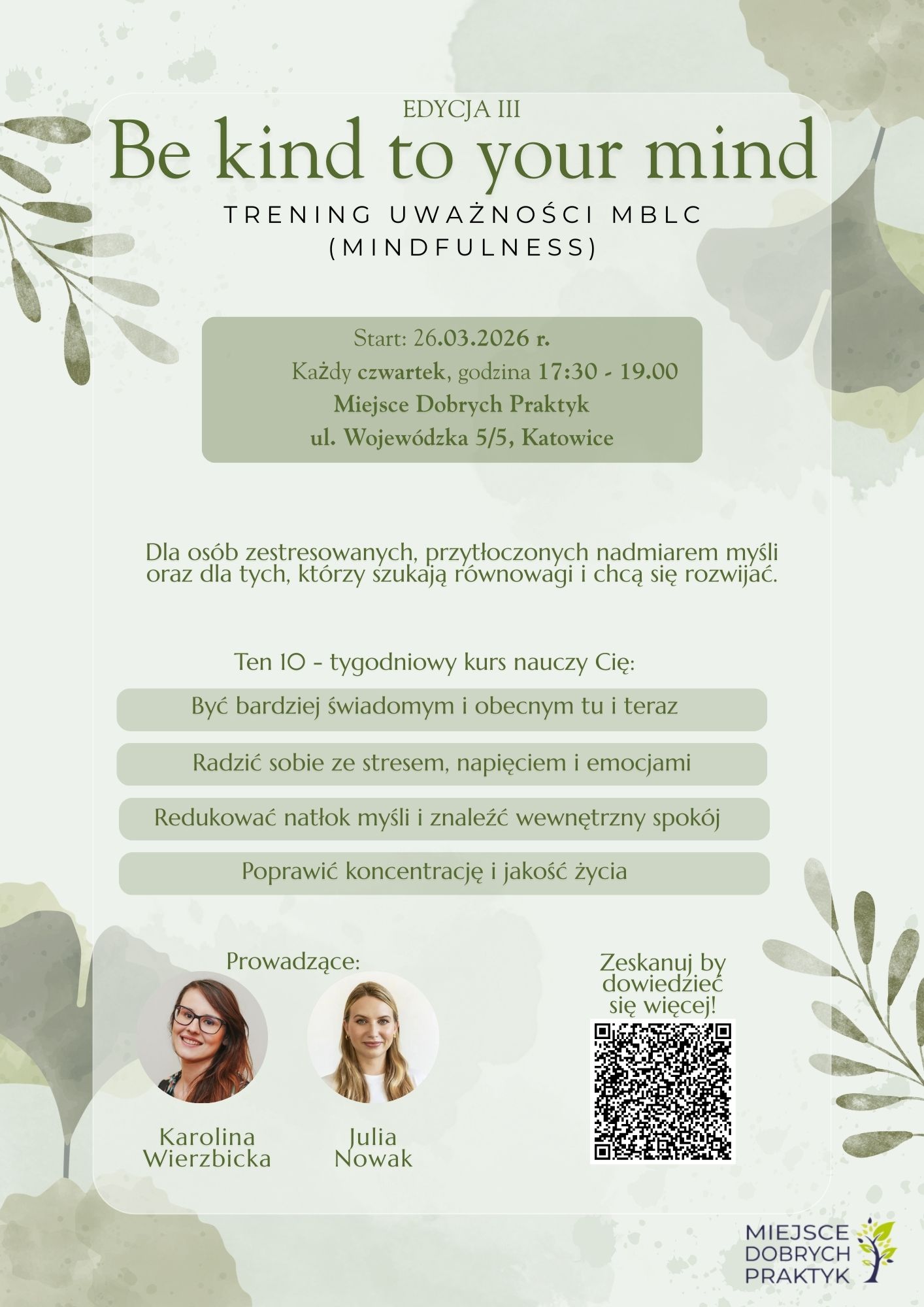 „Be Kind to Your Mind” to 10-tygodniowy kurs oparty na programie Mindfulness Based Living Course (MBLC), który pomoże Ci odnaleźć spokój, równowagę i większą obecność w codziennym życiu.